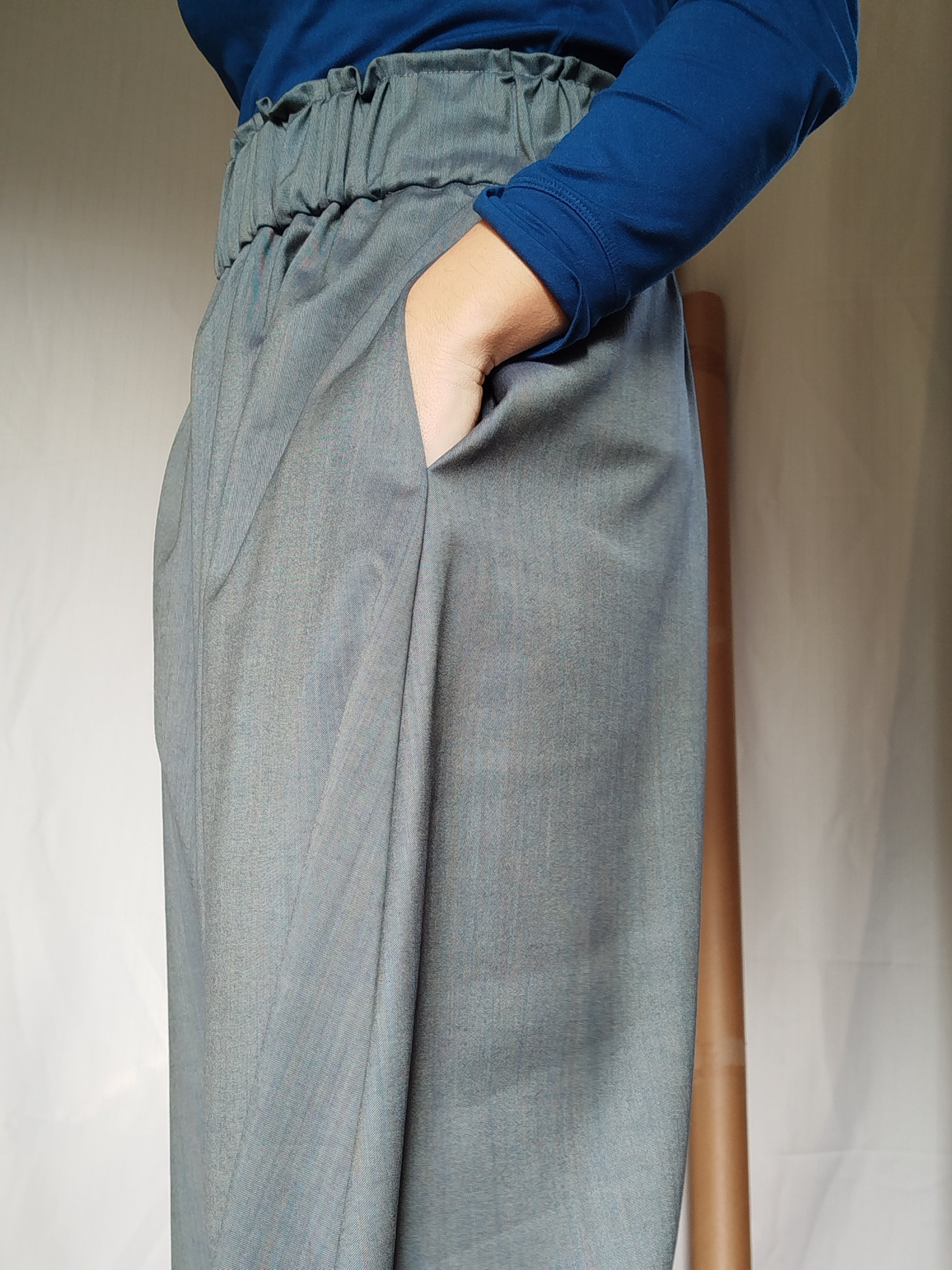 Modello Harem con cavallo basso, elastico in vita e due comode tasche.